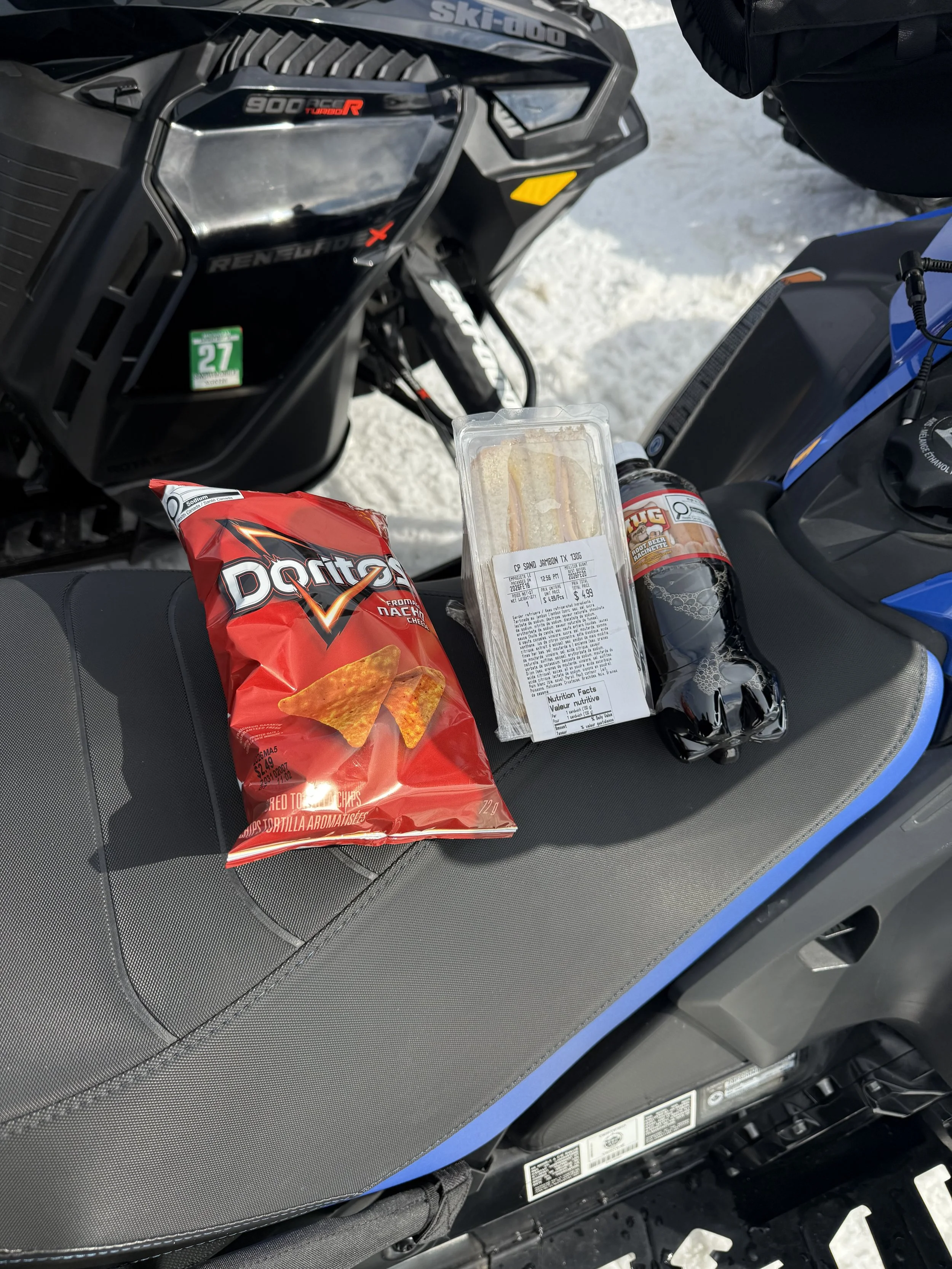 Our first fuel stop was after about 100 miles. Orange Helmet offered us lunch, surprise, surprise, after our fuel stop. We drove about 4 blocks in the quaint town of Belleterre to the local restaurant. Typical for us, they were not open. Someone mentioned the gas station we just left has sandwiches and such, lets just go back there and have a “snowmobiler” lunch on our sleds. Our wide assortments were ham and cheese, or egg salad sandwiches. I was really tempted for the egg salad option, but just felt that wasn’t the right choice for a day on the trail. Ham and cheese and a bag of Doritios, with a Mug Root Beer to top it off. Perfect.