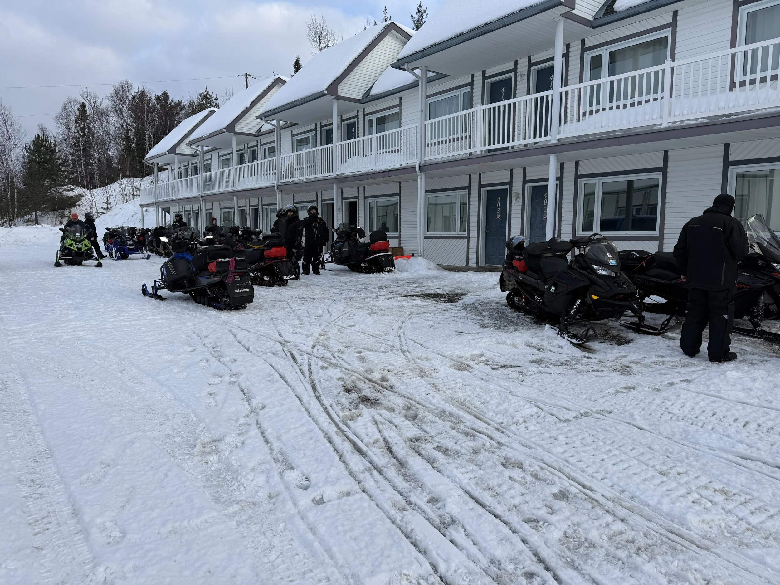 We are now at the Pourvoirie La Verendrye. This place is in a DESOLATE area overlooking a lake and quite a treat. It runs on a generator. And apparently the new to us proprietors have, in our opinion, improved the amenities. They offer fuel for the sleds, and overnight lodging for traveling sledders. They are open during the day for lunch and bar services, but the overnight guests are given free range of the very well appointed, but yet rustic lodge. Our dinner service is 3 pans of lasagna that we need to heat up in the oven, garlic bread made of hot dog buns, and a big pot of minestrone soup that we warmed up on the stove top. The proprietors began our visit with meeting us at their fueling center, on the grounds then He sent us inside for , i presume, his wife to collect the gas money, show us where the rooms are, and you pick out your own room from the shown selection. Then she showed Orange Helmet the kitchen facilities, how to use the stoves, and said, ok you're on your own. Oh, and by the way, eggs, bacon and bread are in the Fridge, make your own breakfast, and see yourself out in the morning, and off they went to their private cottage on the property, about 100 yards away from the main lodge. These are the locations we love to enjoy on our adventures!