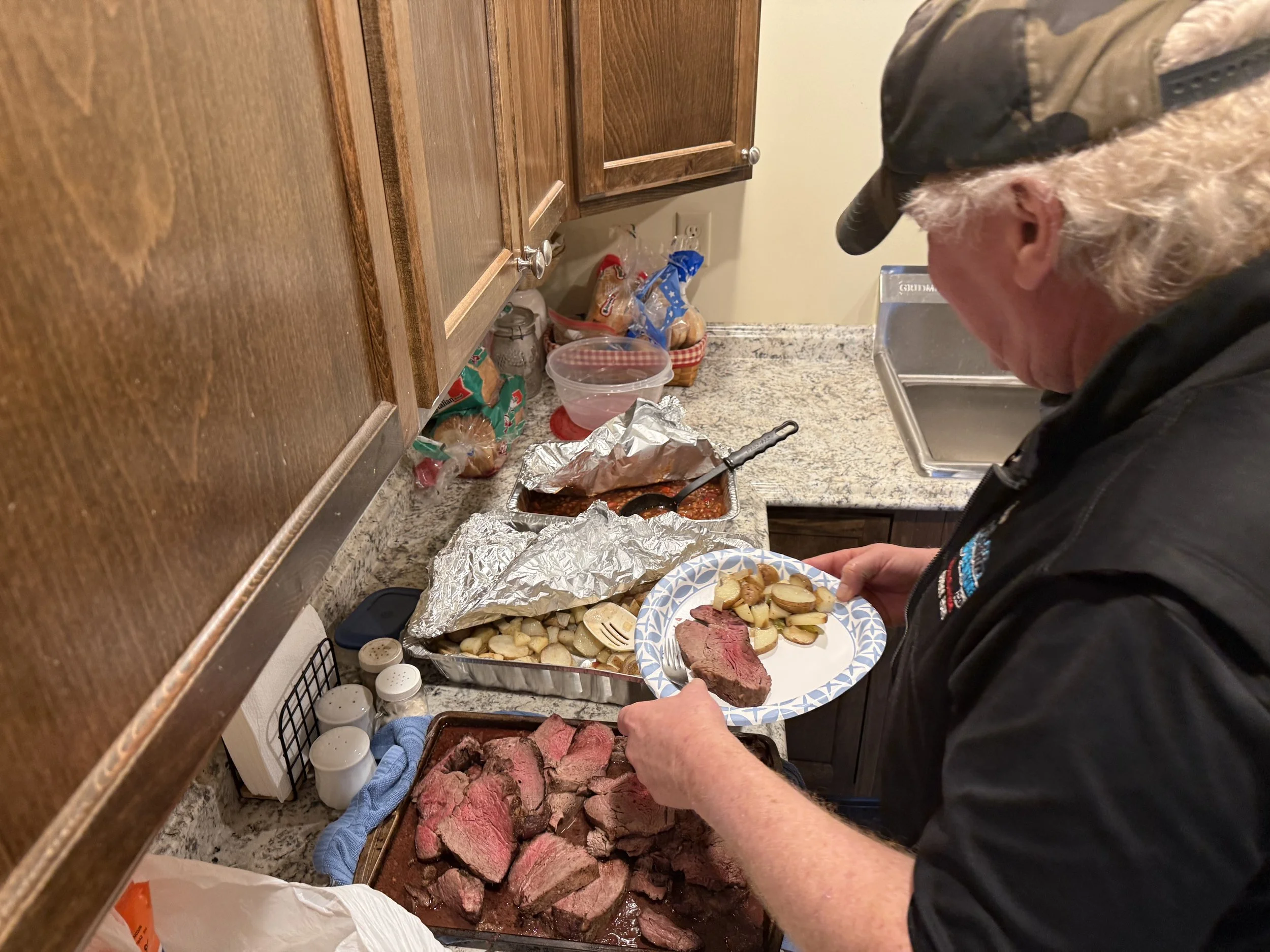 On a side bar, I just got up to get a second serving of the lasagna and saw a couple dirty plates already stacking up in the sink. So I asked Orange Helmet, do we clean the dishes when we are done too? He replied, well she told me that we could either do the dishes, or just stack them up in the sink, and he will handle them tomorrow. For a generous tip, of course. Last I looked Connecticut and Steve were on KP duty, so we can have clean plates for breakfast! And our new to the Quebec Group, but familiar to the Michigan crew, The MailMan is getting desert. I’ll be right back. Need to see what is being offered.