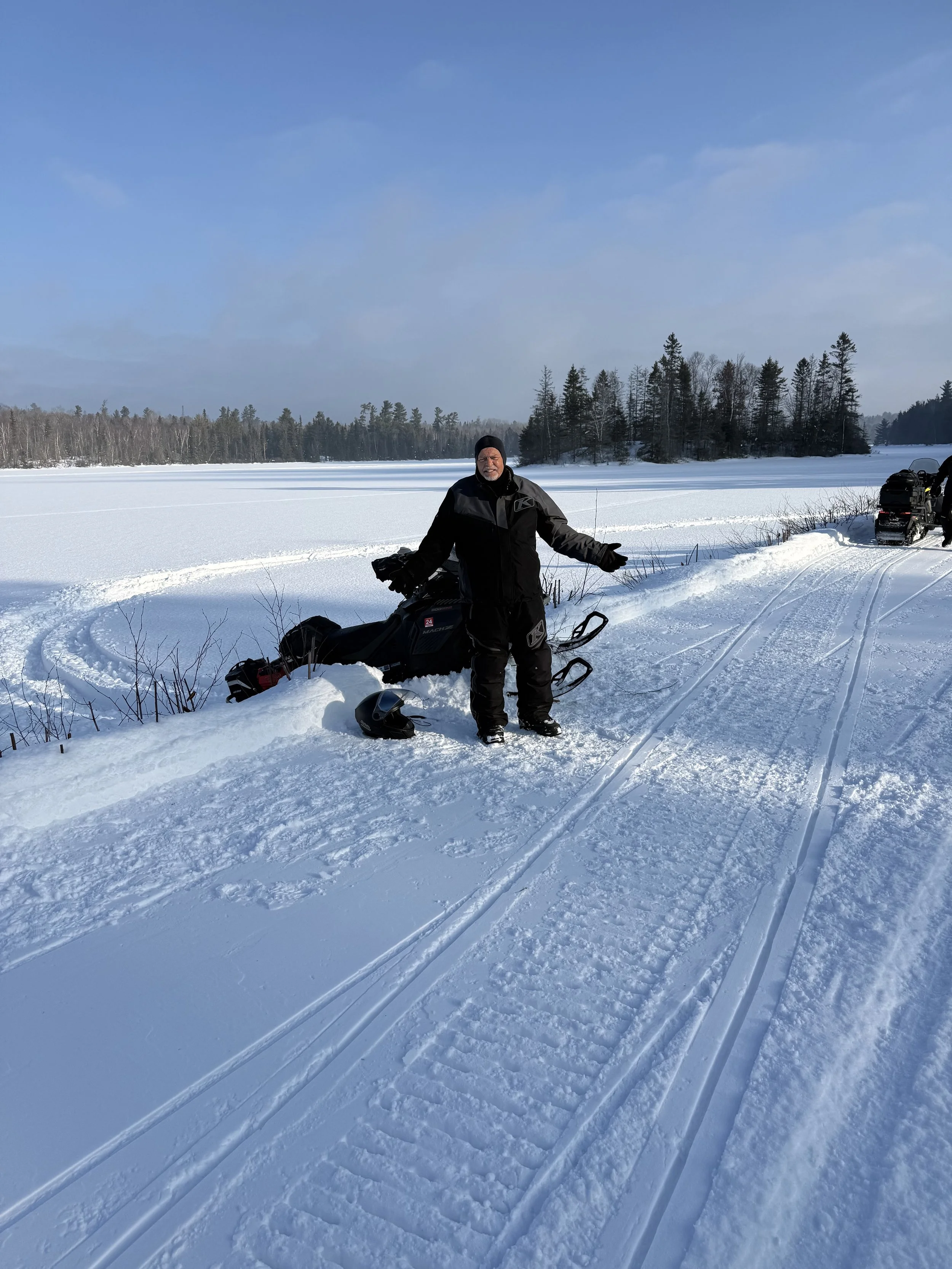 We were told the mileage for the day was “about” 200 miles. Sure, we shall see. Stick and Robere’ needed to fuel their sleds, as they didn’t get the memo that everybody else left home with full tanks of petro in their sleds. They were loaded quickly after breakfast, and Action Dan led them 2.5 miles down the trail to the fuel center, to get filled while the rest of the Team finished their packing and morning “routines”. On their way back they passed a sled trying to pop up off the lake that runs along the sled trail, but had gotten stuck on the lake side drift. We stopped to offer assistance, and to our surprise is was Ole’ Man Ron. He apparently didn’t get the fuel memo either, and was trying to find us for his fueling needs. We got him righted on the trail, and Action Dan took him to the fuel station, and we went back to the motel parking lot to keep the rest of the group “apprised” of the situation.